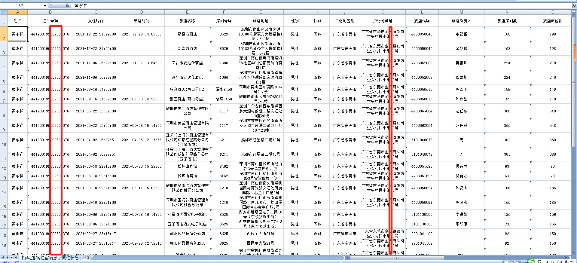 查询个人开房记录及同住人信息